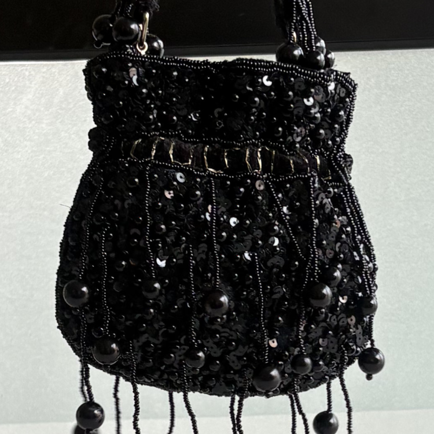 Embellished Beaded Potli Bag with Pearl Handle, Handcrafted potli bag with intricate sequin embroidery, Elegant pearl-embellished top handle, Secure drawstring closure with decorative detailing, Hanging pearl tassels for a graceful finish,Perfect for weddings, festive events, and parties